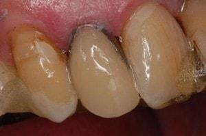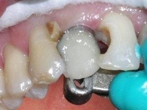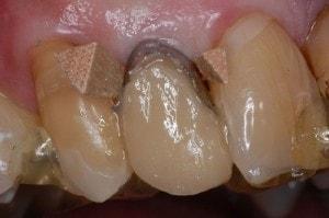 As done previously matrix is cut back intra-orally. Distal contact “smoothed in” with football finishing bur.