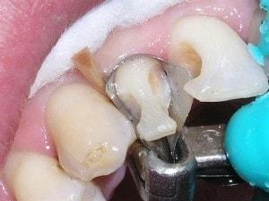 Matrix trimmed labially. Contact openings made. Wood wedges are lightly placed to secure the matrix only. The wood wedges are not used to force the teeth apart. Wedging in the traditional sense is not necessary, since the contacts will be a direct build against the adjacent teeth. In lieu of using a retainer Triad Gel holds the matrix in the proper position.