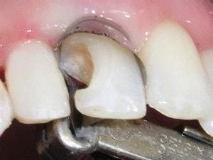 Contact is broken with the blade end of a composite placing instrument. Matrix severed in the middle, and each segment lifted through the contact. Distal matrix segment can be seen being lifted through the contact (see arrow).